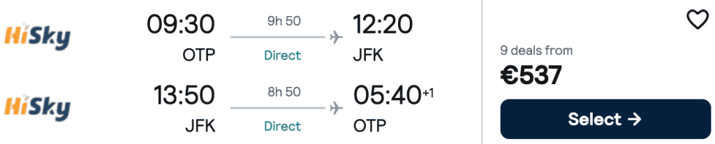 ZBOR: București -> New York, Preț dus-întors 537€/pers, 8-15 Iul 2026