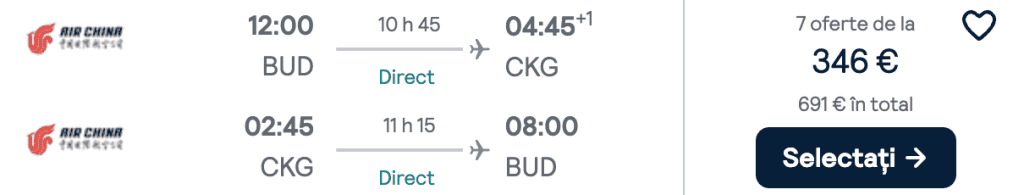 ZBOR: Budapesta -> Chongqing, Preț dus-întors 346€/pers
