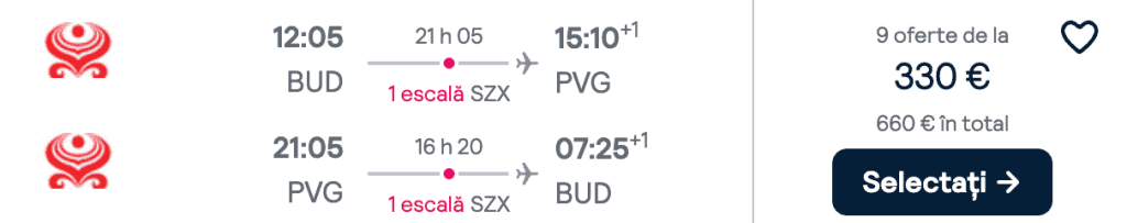 ZBOR: Budapesta -> Shanghai, Preț dus-întors 330€/pers