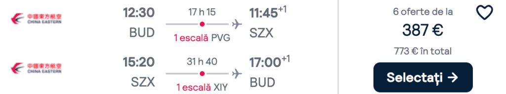 ZBOR: Budapesta -> Shenzhen, Preț dus-întors 387€/pers
