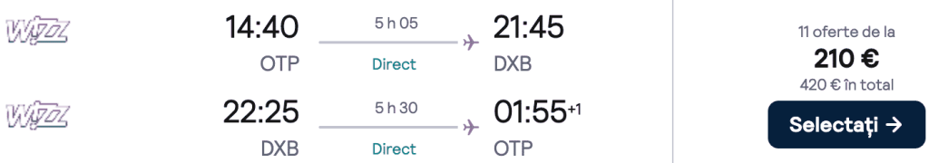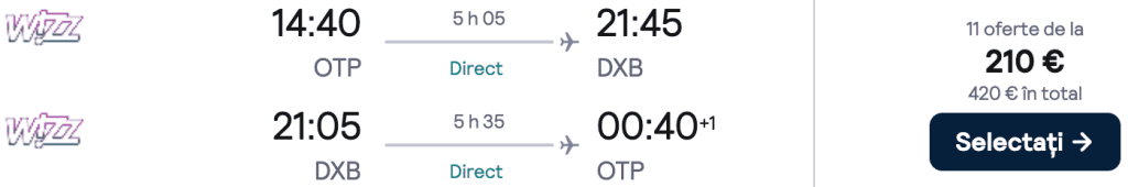 ZBOR 1: București -> Dubai, Preț dus-întors 210€/pers, 2-27 Mar 2026