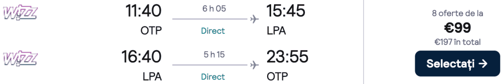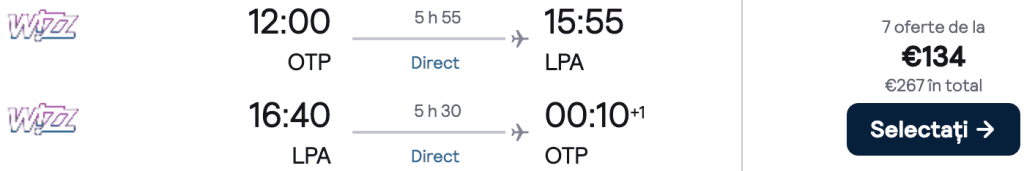 ZBOR: București -> Gran Canaria, Preț dus-întors 134€/pers, 14-21 Apr 2026