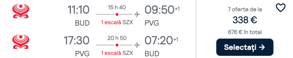 ZBOR: Budapesta -> Shanghai, Preț dus-întors 338€/pers