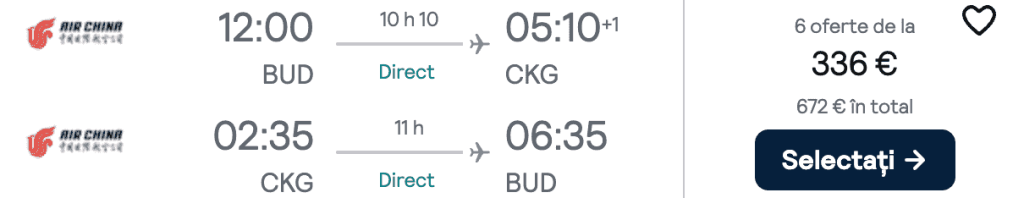 ZBOR: Budapesta -> Chongqing, Preț dus-întors 336€/pers